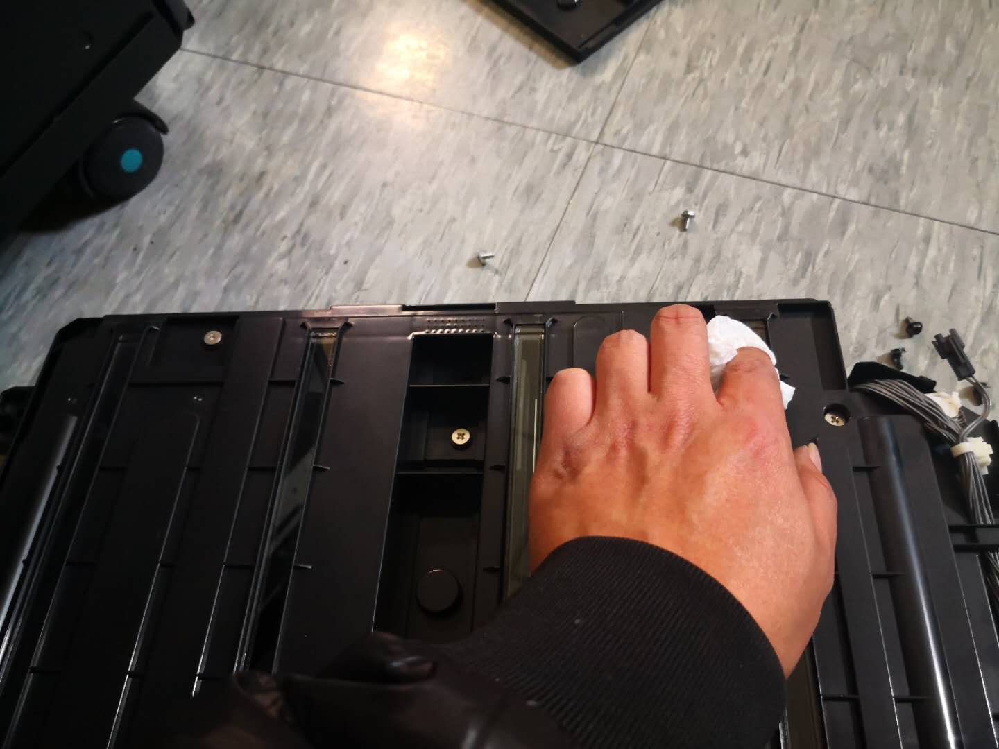 - 2、虽然说电话指导客户做过犄缝清洁处理工作,但不能保证客户能清洁到位因此对机器进行一系列全面清洁,清理二转辊以及辊下灰尘、拉主充清洁杆和犄缝玻璃清洁杆后直接采用复印白板得出全黑画面发现故障依旧存在。