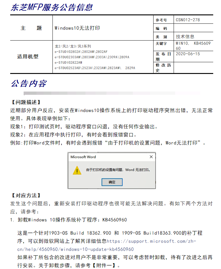 近期接到不少客户报修说打印不了,其共同现象均为WIN10系统,打印机型号是龙凤机型,貌似都是采用了GDI驱动来着,当时我们上门给客户调试时也发现只要一打印就会直接闪退,好不郁闷最后才发现客户近期有自动更新,更新时间为6-10号,主要更新了三个补丁,针对该情况我们直接为客户卸载这三个补丁后再测试,打印的故障就解除了,事后在查看资料发现,6-12号微软已经发布了最新的公告具体内容如下: