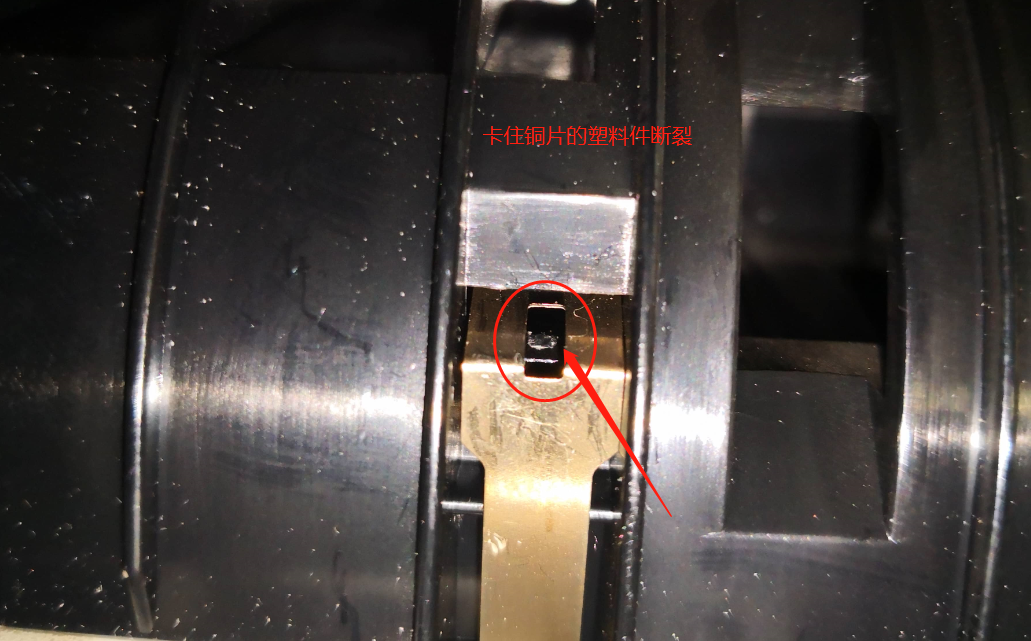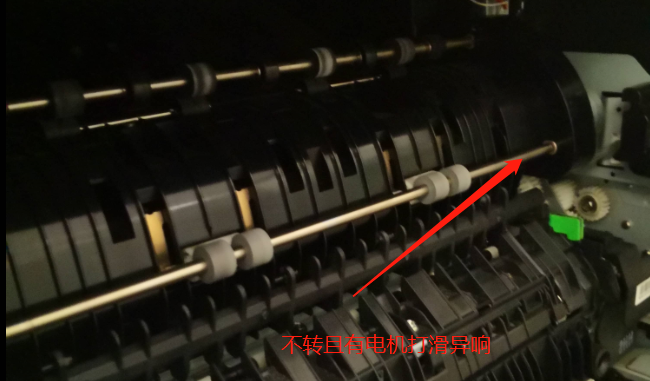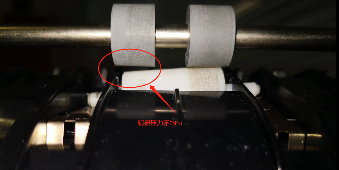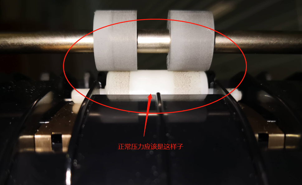 在反转单元上还有一个最为常见的故障就是反转辊对应的压力轮,是由二个铜片顶住的,如果其中一个顶住铜片的塑料件断裂会使这个压力轮失去弹力导致缝隙从而导致卡纸或间歇性卡纸还有就是纸张偏移,常规的解决方案也简单用手顶住铜片然后在缝隙处加入AB胶,让铜片恢复压力即可。