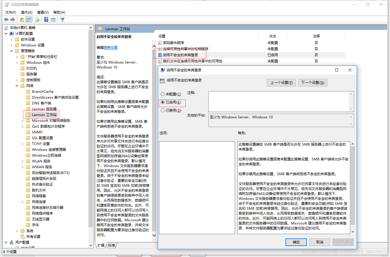 按win+R 调出运行:输入”gpedit.msc” 打开组策略–计算机配置–管理模板–网络–Lanman工作站–启用不安全的来宾登录–选择已启用,设置完成后重启win10