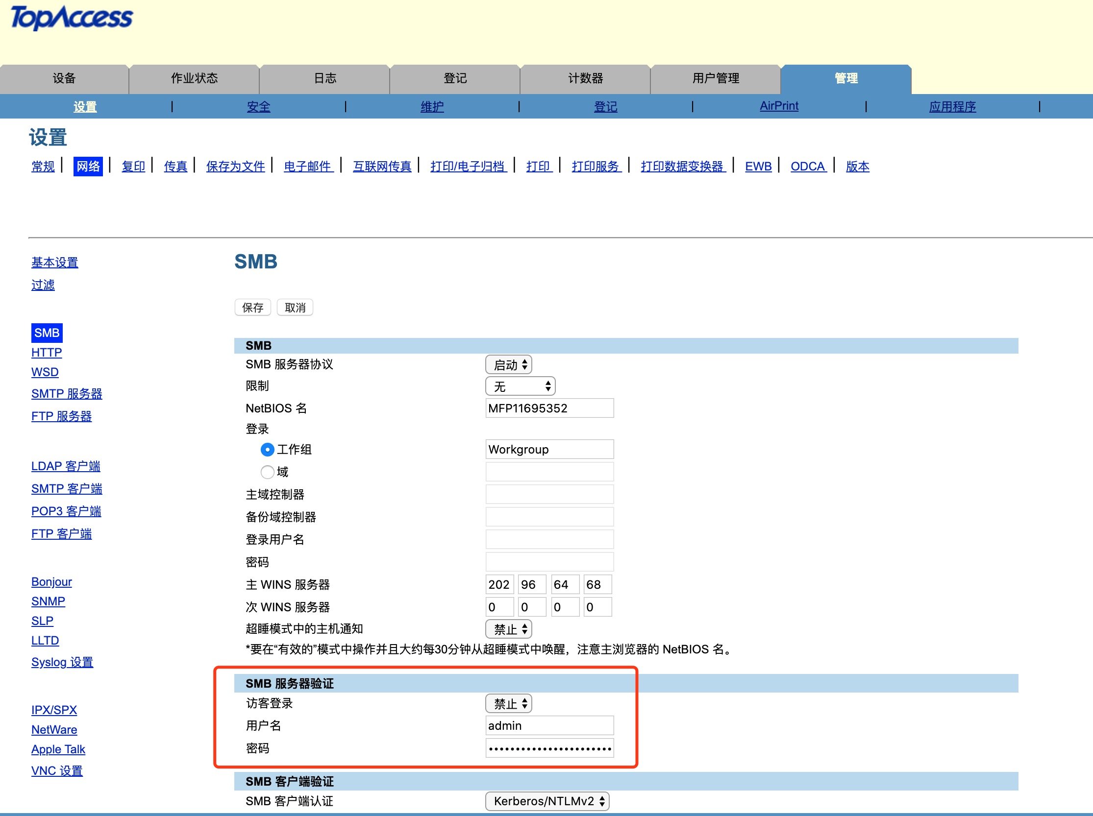 升级MFP系统到L6.5,更新解决后到TOPACCESS后台,在SMB服务器验证里调整设置可解决问题。