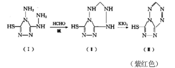 4-氨基-3-肼基-5-巯基-1,2,4-三氮唑(AHMT)法的原理为 4-氨基-3-肼基-5-巯基-1,2,4-三氮唑 (AHMT) 在碱性条件下与甲醛进行缩合反应;高碘酸钾可将反应产物氧化成紫红色化合物,其颜色的深浅与甲醛含量成正比,通过体系的吸光度可计算定量甲醛的浓度。反应过程如下: