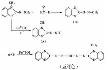 酚试剂3-甲基-2-苯并噻唑啉酮腙盐酸盐水合物(MBTH)检测原理为3-甲基-2-苯并噻唑啉酮腙盐酸盐水合物(酚试剂)对于醛类具有极高的灵敏度,空气中的甲醛与3-甲基-2-苯并噻唑啉酮腙盐酸盐水合物反应生成嗪,嗪在酸性溶液中被高铁离子氧化形成蓝绿色化合物,同时根据颜色深浅,能够比色定量甲醛的浓度。反应过程如下: