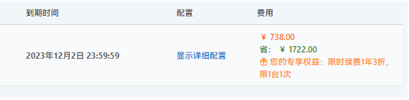 不知不觉又是三年过去了,这几天马爸爸的阿里云天天发短信让我续费云服务器,登陆上去一看直接傻眼,续费一年要738,可三年前我一次性购买才花了680来着,这不是坑吗?直接选择无视!到期就走!咱换个云服务器供应商。