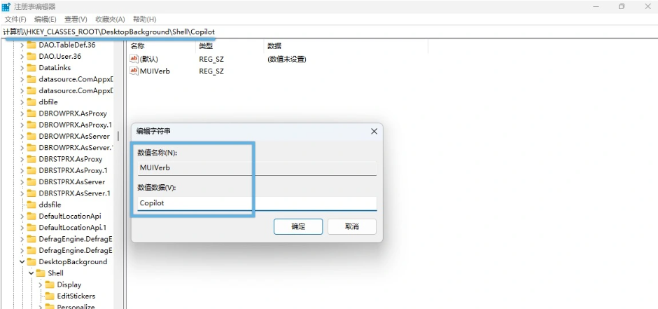 4、在 Copilot 项中创建一个名为 MUIVerb 的「字符串值」,并将其值设置为 Copilot。