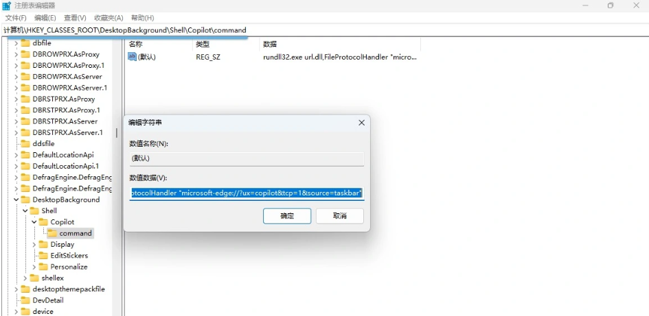 5、在 Copilot 中创建一个名为 command 的「项」,并将 command 项中 默认 字符串值的「数值数据」设置为: