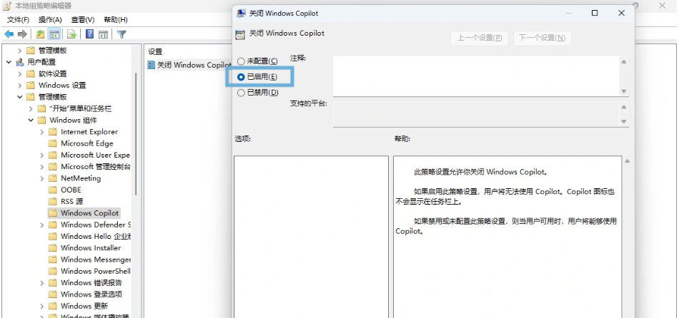3、在右侧窗格双击「关闭 Windows Copilot」策略,选择「已启用」选项,然后点击「应用」和「确定」以保存更改。
